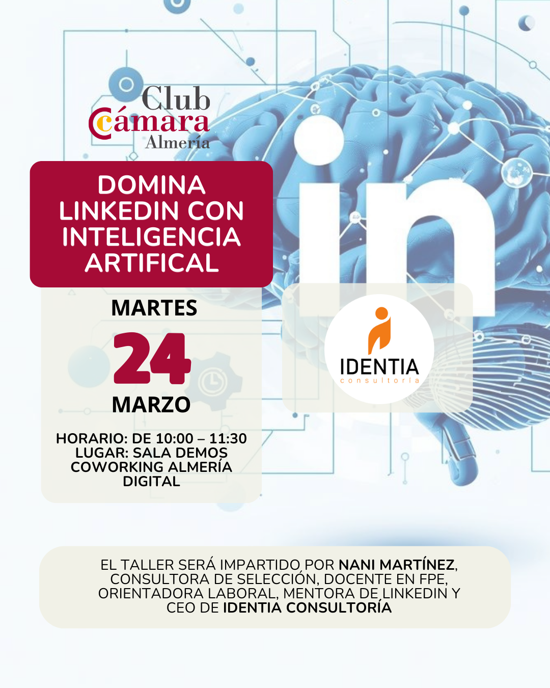 A través de una sesión práctica y dinámica impartida por Nani Martínez, CEO de IDENTIA Consultoría, aprenderás a optimizar tu perfil para que trabaje por ti las 24 horas, crear un perfil estelar, redactar mensajes de impacto con ayuda de la IA, analizar palabras clave y mejorar tu visibilidad y networking en la red profesional más importante del mundo.